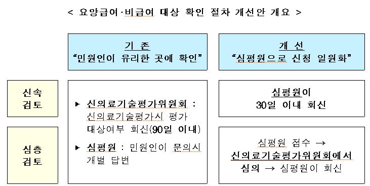또한 이번 개정안에서는 신의료기술평가 신청인이 해당 의료기술이 요양급여·비급여 대상인지 확인하는 절차가 기존에는 심평원과 신의료기술평가위원회로 이원화되어 있었지만, 향후에는 요양급여·비급여 여부를 확인하는 창구를 심평원으로 단일화하여 심평원이 기존 결정사례 등에 근거해 직접 확인이 가능한 것은 30일 이내에 회신하고 심층적 검토가 필요한 경우에는 신의료기술평가위원회의 심의를 거쳐 신청인에게 회신할 수 있도록 했다.