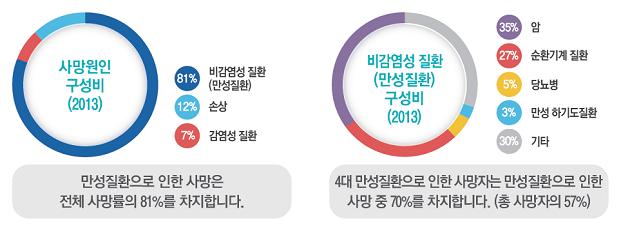 특히 순환기계 질환․당뇨병․만성 하기도질환․암은 만성질환으로 인한 사망의 70%를 차지(전체 사망자의 57%), 이들 주요 만성질환에 대한 예방․관리가 중요하다고 질병관리본부는 설명했다. 실제 세계보건기구에서도 전 세계적으로 질병 부담이 높은 심혈관질환․당뇨병․만성 호흡기질환․암을 4개의 주요 만성질환으로 지정, 이에 대한 국가적 차원의 대책 마련을 권고하고 있다.