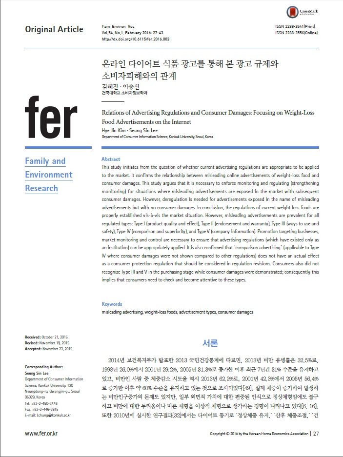 지난 2월 29일 한국식품커뮤니케이션포럼에 따르면 ‘대한가정학회지’ 올 2월호에 소개된 건국대 소비자정보학과 이승신 교수팀의 ‘온라인 다이어트 식품 광고를 통해 본 광고 규제와 소비자피해와의 관계’란 제목의 연구에서는 공정거래위원회가 운영하는 소비자상담센터 전화(1372)와 인터넷 상담을 통해 확인된 다이어트 식품 구매자의 온라인상의 부당ㆍ불법 광고로 인한 피해 사례 148건(2012년)을 분석했다.
