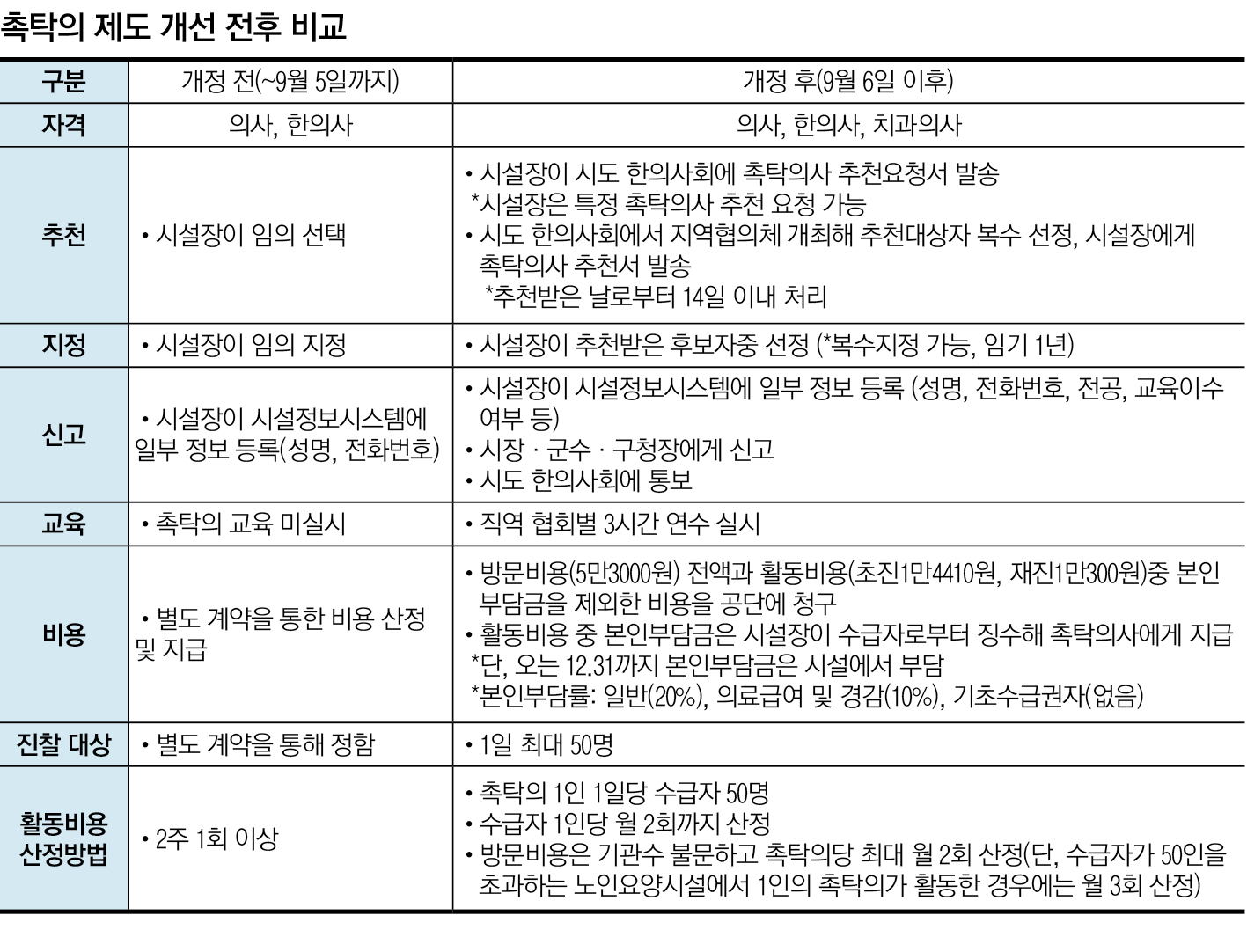 앞서 보건복지부(이하 복지부)는 노인요양시설 내 의료서비스 강화를 위해 촉탁의의 자격·지정·교육·활동비 등 제도 전반에 대한 개선안을 마련, 9월 6일부터 시행되는 것으로 관련 고시를 개정한 바 있다.