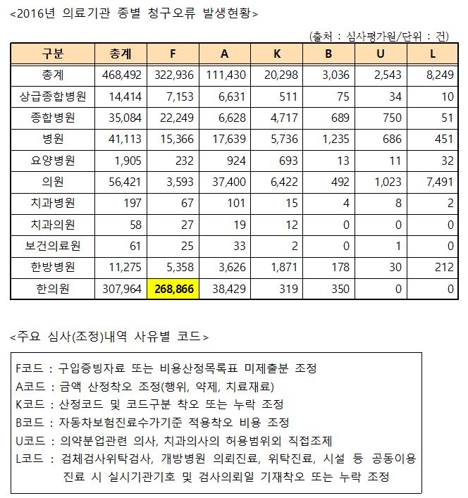 특히 한의원의 청구오류 중 87.3%인 26만8866건이 행정처리 미흡에 의한 단순 청구 오류인 ‘F코드’로 나타나 주의가 요구된다.