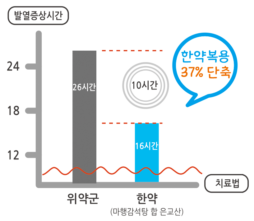 또한 동 연구에서 위약복용군의 발열 증상 시간은 26시간이었으나 한약 ‘마행감석탕 合 은교산’ 복용군은 16시간으로 약 37%가 단축됐다(그림2 참조).