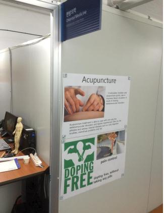 폴리클리닉 한의과 앞에 붙어있는 포스터. ‘침술’에 대한 설명과 ‘도핑으로부터 안전하다’는 내용을 담고 있다.[/caption]