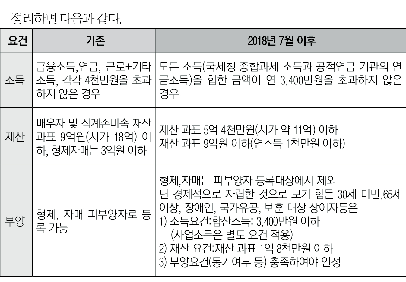 현재까지는 부모나 자녀 등 직계존비속이 아닌 형제, 자매도 피부양자가 될 수 있었다. 이제는 형제, 자매는 원칙적으로 제외가 된다. 단 장애인, 30세 미만, 65세 이상인 형제, 자매가 소득 및 재산 기준을 충족하는 경우에만 피부양자가 될 수 있다.