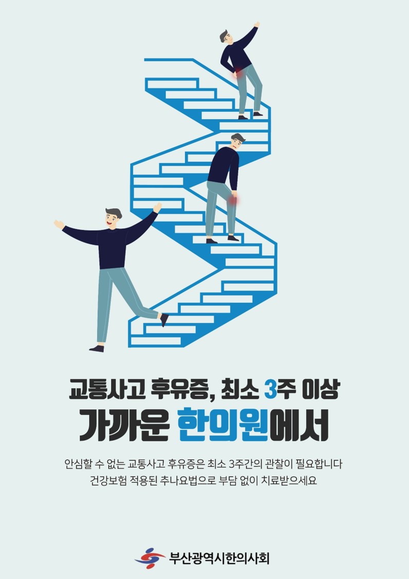 또한 포스터에서는 '교통사고 후유증, 최소 3주 이상 가까운 한의원에서'라는 큰 주제 아래 '안심할 수 없는 교통사고 후유증은 최소 3주간의 관찰이 필요합니다. 건강보험 적용된 추나요법으로 부담없이 치료받으세요'라는 내용을 전달하고 있다.