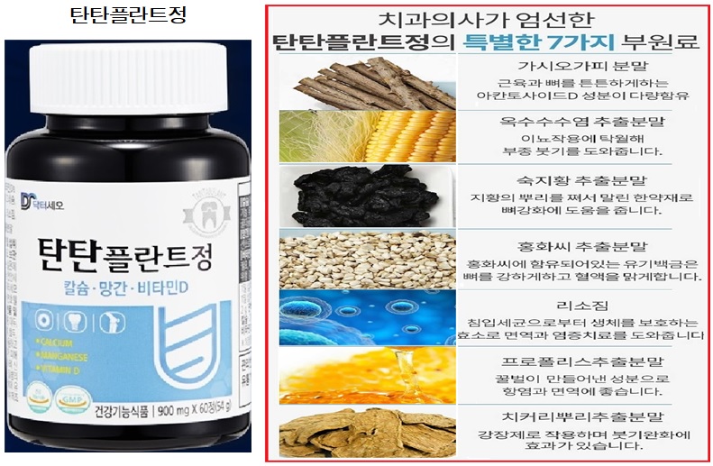 주요 위반 사례를 살펴보면 ○○의사가 만들었다는 ‘탄탄플란트정’ 제품은 “잇몸건강”, “특별한 7가지 부원료를 사용”했다는 광고로 자율광고 심의 내용과 다르거나 심의 결과를 따르지 않고 광고하다 적발됐다.