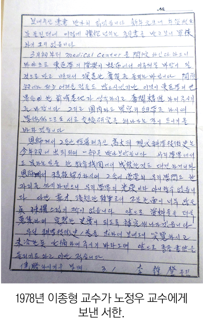 두달 전 故노정우 교수(1918〜2008)의 사위되시는 윤동원 원장(미국 L.A 가야한의원 원장)과 따님 노효신 선생이 경희대 한의대 의사학교실에 기증한 노정우 교수 유품 안에서 다음과 같은 서신을 발견하였다.