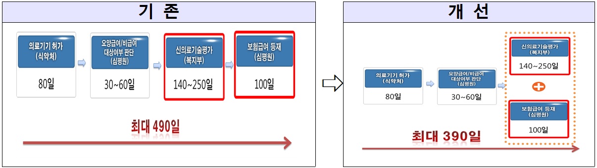 신의료기술평가와 보험등재심사 동시 진행은 2018년 7월 발표된 '의료기기 규제혁신 및 산업육성방안'의 후속조치로 복잡한 규제절차로 인해 시장 진입이 다소 오래 걸렸던 부분(최대 490일)을 개선하기 위함이다.