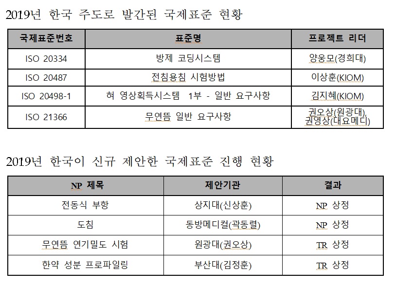JWG1에서는 한국한의학연구원 이승호 선임연구원이 TC215(의료 정보)에서 제안해 개발 중인 ‘전탕표시구조’의 기술시방서(TS) 발간이 합의돼 올해 내로 발간될 예정이며, JWG6에서는 상지대 신상훈 교수가 식약처의 관련 가이드라인을 기초로 한 ‘전동식 부항’ 국제표준을 제안해 NP 투표 상정이 결의됐다.