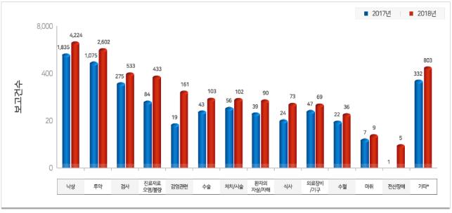 이번에 발간된 통계연보는 '환자안전법' 시행('16.7.29.)에 따라 자율적으로 보고된 환자안전사고의 유형, 빈도 등 보고추이를 2017년 통계와 비교해 한눈에 살펴볼 수 있다.