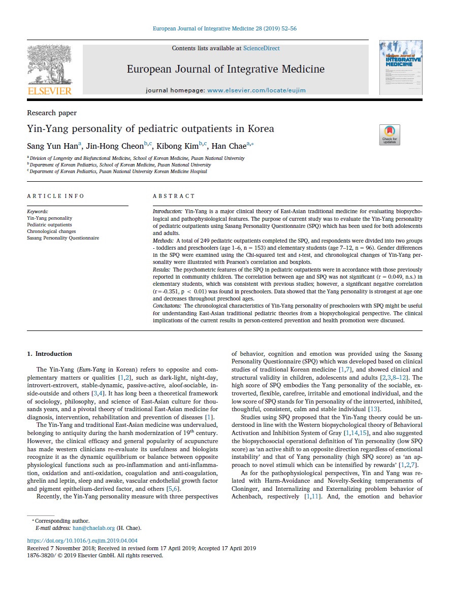 ‘Yin-Yang personality of pediatric outpatients in Korea(한국 소아과 환자에서의 음양성격)’이라는 제목으로 소개된 이번 연구는 한방 소아과에서 천여 년간 사용돼 온 ‘소아는 양(陽)의 성질이 가장 강하다’는 생리 이론을 임상적으로 증명한 것이다.