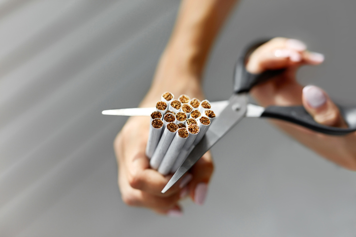 Quit Smoking. Closeup Of Female Hands Holding Bunch Of Cigarettes And Cutting Them In Halves With Scissors. Stop  Smoking Cigarette Concept. High Resolution