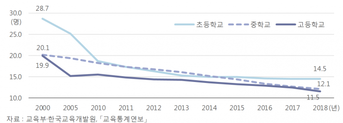 고등학교는 더욱 심각해 학급당 학생 수는 19.9명에서 2018년 11.5명으로 ‘수직낙하’했다.