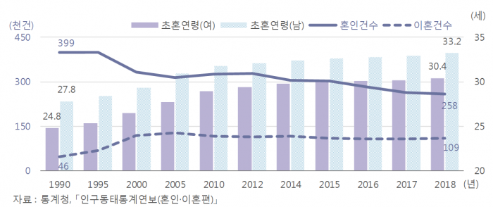 평균초혼연령도 남성의 경우 지난 1990년 27.8세에서 지난해 33.2세를 기록해 5.4세 증가했으며, 여성의 경우 24.8세에서 2018 30.4세로 5.6세 증가했다.