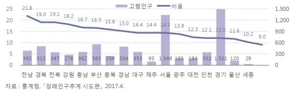 전라남도가 21.8%로 가장 높고, 그 다음은 경상북도(19.1%), 전라북도(19.0%) 순이었으며, 세종특별자치시(9.0%), 울산광역시(10.2%), 경기도(11.6%) 순으로 노인인구 비율이 낮았다. 문제는 수도권에 인구가 쏠리는 ‘이촌향도(離村向都)’ 현상이 지속될 전망이어서 지방의 경우 소멸할 것이라는 점이다.