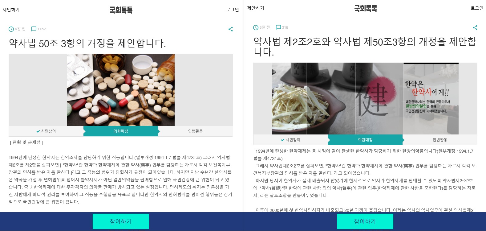 시민들이 만들고 싶은 법을 직접 올리는 '국회톡톡(http://toktok.io)'에서 약사와 한약사의 약사법 개정 요구가 올라왔다.