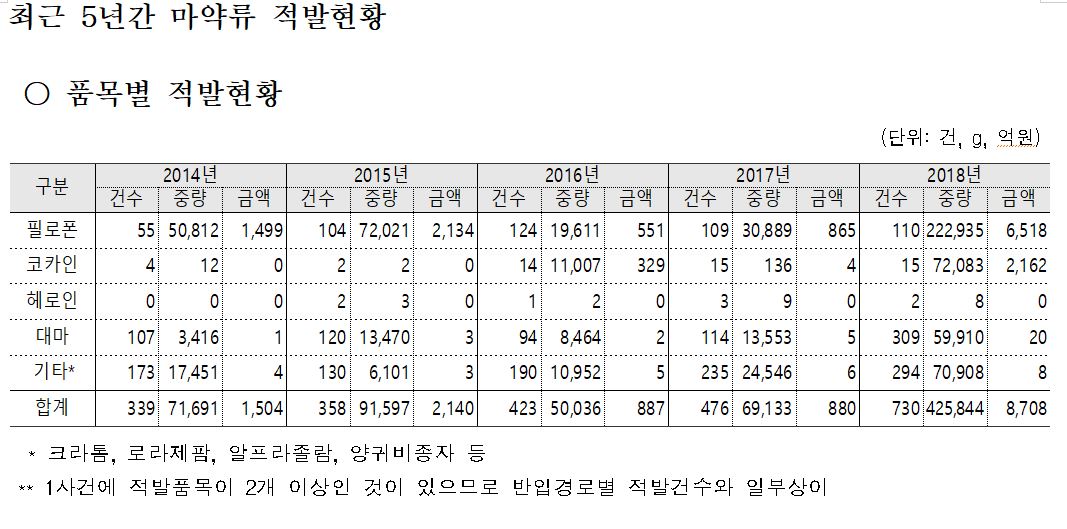 관세청은 각각 2014년 71.6kg(339건), 2015년 91.5kg(358건), 2016년 50kg(423건), 2017년 69kg(476건), 2018년 426kg(730건)의 마약류를 적발했다. 1회 투여량을 0.03g으로 계산했을 때, 2018년에 적발된 것만 하더라도 1,420만여 명이 투약가능한 양이다.