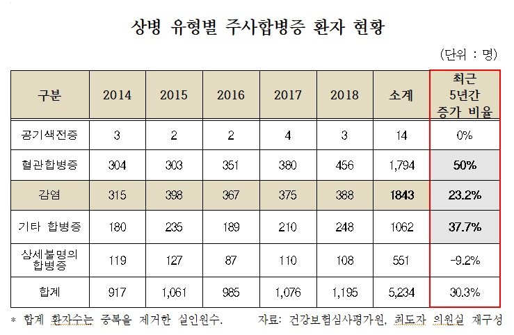 이와 관련 최도자 의원은 "주사로 인한 합병증이 지속적으로 증가하고 있지만 감염 외 합병증 발생 요인에 대한 기초적인 현황 파악조차 이뤄지고 있지 않다"며 "보건당국은 주사로 인한 합병증 발생 원인을 분석하고, 주사제 부작용 예방대책을 마련해야 한다"고 강조했다.
