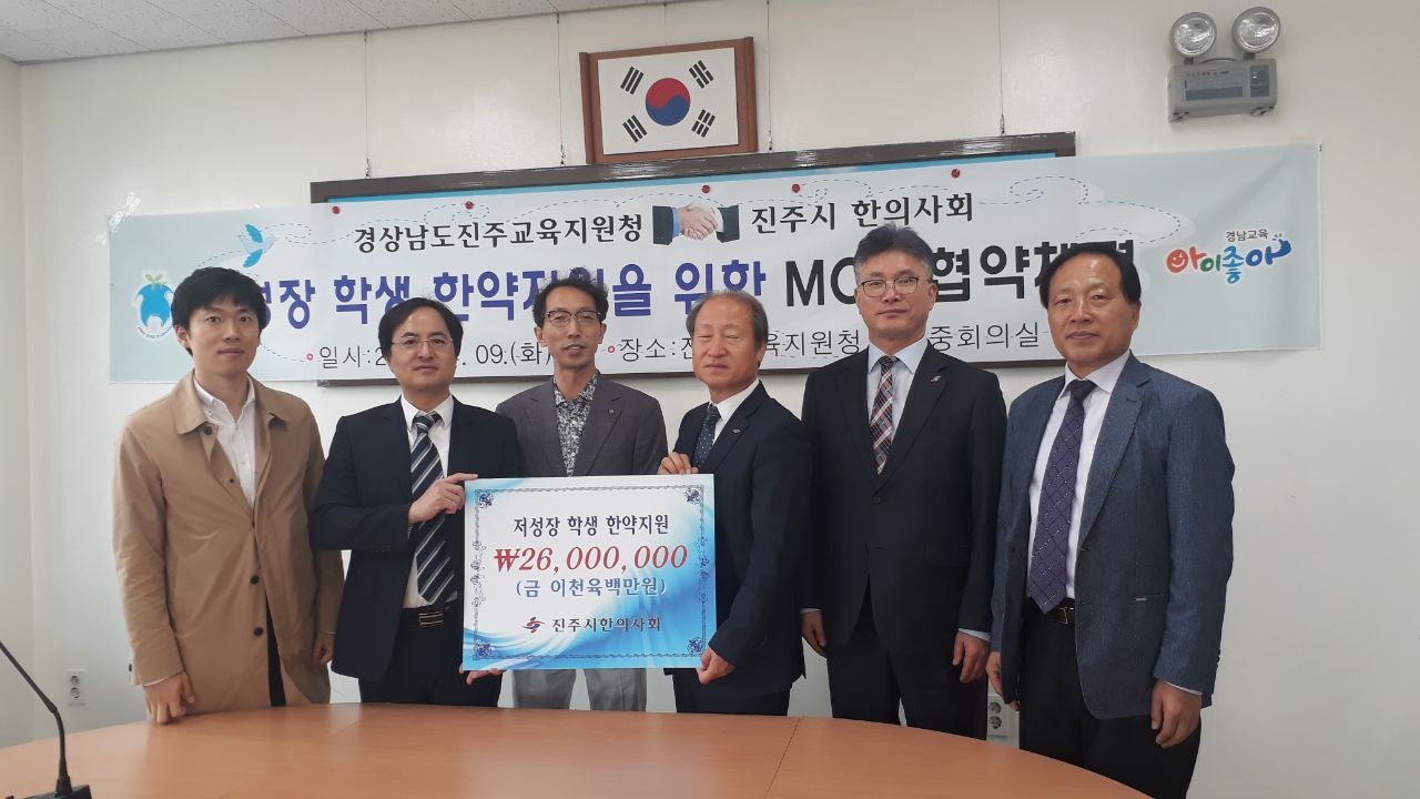 [한의신문=강환웅 기자] 경상남도 진주교육지원청과 진주시한의사회는 9일 진주교육지원청에서 관내 저성장 초·중학생 발달 지원을 위한 '한약 지원 MOU' 체결식을 가졌다.
