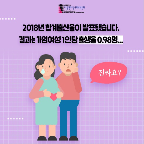 이는 출산이 늦은 연령으로 미루어지고 있는 것은 물론 결과적으로 실현되지 못하고 있는 것에 주요한 원인이 있는 것으로 지적됐다. 이에 따르면, 우리나라의 합계출산율은 1984년에 인구대체수준인 2.10명 이하로 낮아졌으며, 2000년대 초반에 초저출산수준인 1.3명 이하로 하락한 실정이다. 특히 최근 3개년간의 추이를 살펴보면 2016년 1.17명, 2017년 1.05명이었던 것이 2018년에는 0.98명(잠정)으로 급락했다.