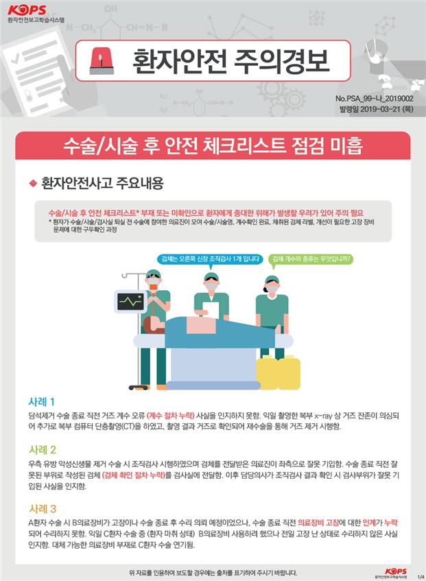이번에 발령한 환자안전 주의경보에는 의료기관 내 수술·시술 후 안전 체크리스트 점검 절차 부재 또는 미확인으로 인해 환자에게 위해가 발생한 환자안전사고의 보고 현황과 함께 이러한 환자안전사고의 재발 방지를 위한 권고사항 및 관련 예방 활동 사례 등이 포함돼 있다.