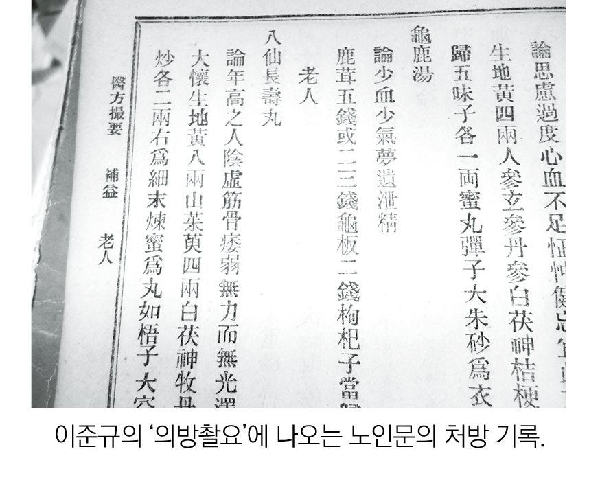 『醫方撮要』의 이론부분 뒤에 風, 五疸, 補益, 老人의 네 번째 항목으로 ‘老人’門을 설정한 것은 노인성 질환을 우선해서 앞쪽에서 다루어 사회적 시급성의 해결책을 제시하려는 것이 아닌가 한다. 이 ‘老人’ 부분에 八仙長壽丸과 瓊玉膏의 두 개의 처방이 소개되어 있다.