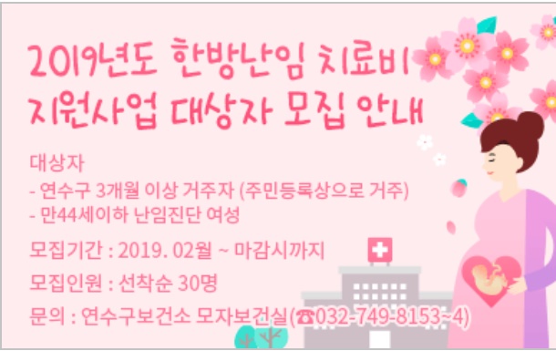 [한의신문=강환웅 기자] 인천광역시 연수구보건소는 '2019년도 한의 난임 시술 의료비 지원사업' 참가자 30명을 선착순 모집하고 있다고 18일 밝혔다.