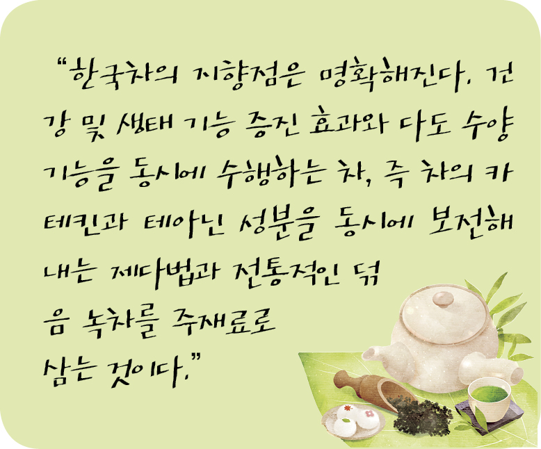 그렇다면 한국적 제다와 한국차의 지향점은 명확해진다. 건강 및 생태 기능 증진 효과와 다도 수양 기능을 동시에 수행하는 차, 즉 차의 카테킨과 테아닌 성분을 동시에 보전해내는 제다법과 전통적인 덖음 녹차를 주재료로 삼는 것이다.