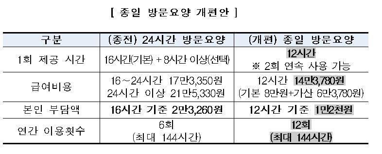 1회 최소 이용시간 12시간으로 조정 및 2회 연속 서비스 가능…본인부담금도 조정