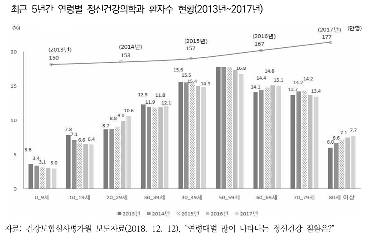 실제 건강보험심사평가원의 자료에 따르면 '17년 정신건강의학과에서 진료받은 환자수는 약 177만명으로 전년대비 5.9%p 증가했으며, 진료비는 1조4317억원(GDP의 약 0.08%)으로 전년대비 2.6%p 늘어난 것으로 나타났다. 또한 '13∼'17년 동안 연평균 환자수는 4.1%p·진료비는 3%p 증가하는 한편 같은 기간 연령대별로는 20대에서 환자수 및 진료비가 가장 많이 증가했으며, '17년에는 0∼9세의 진료비가 174억원으로 전년도에 비해 9.4%p 증가해 가장 많이 증가한 것으로 나타났다.