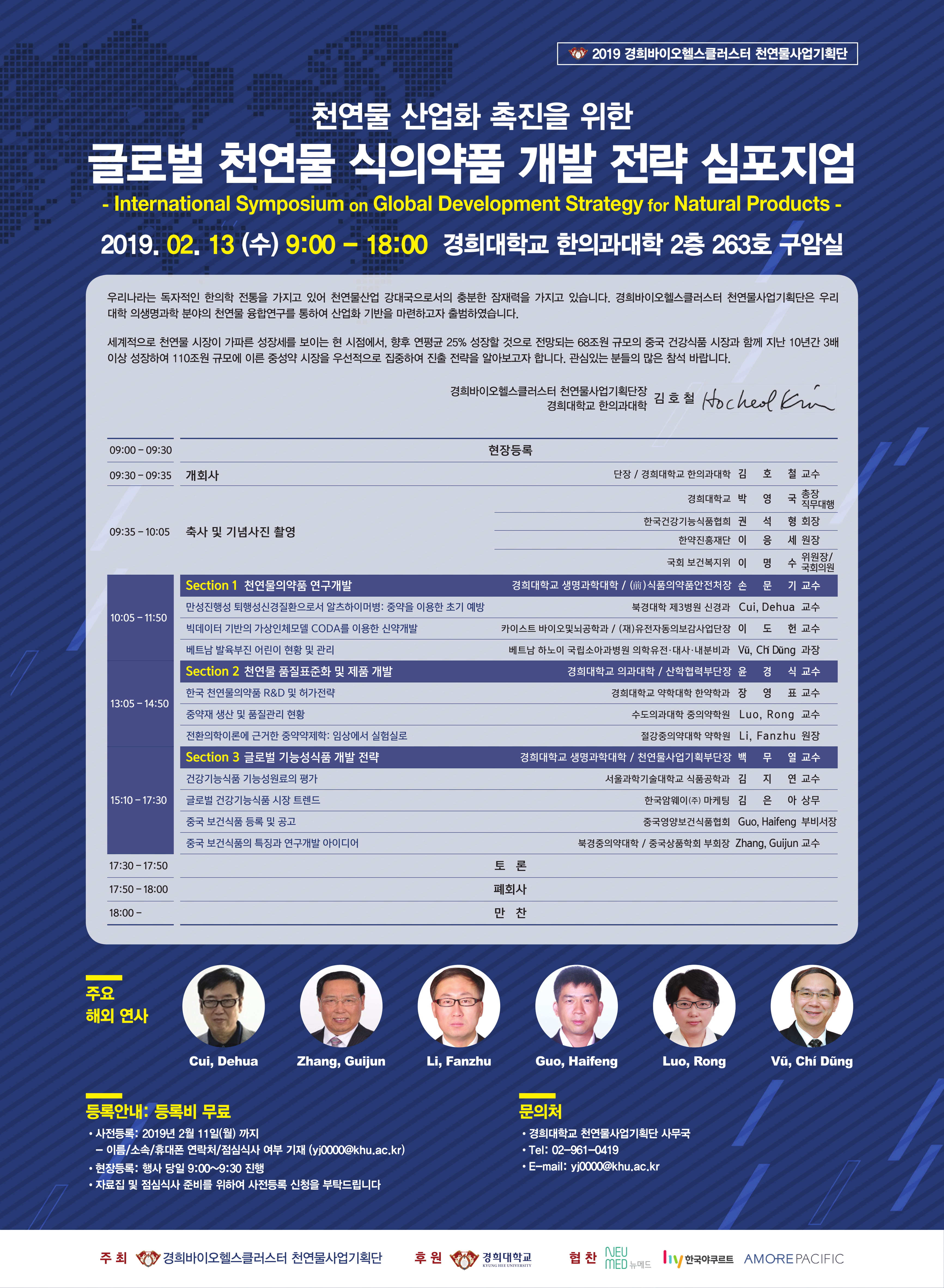 한편 이번 심포지엄의 참가비는 무료이며, 이메일(yj0000@khu.ac.kr)을 통해 사전 등록이 가능하다. 사전 등록할 경우 점심식사와 기념품이 제공되며, 자세한 문의는 경희바이오헬스클러스터 천연물기획단 사무국(02-961-0419)으로 연락하면 된다.