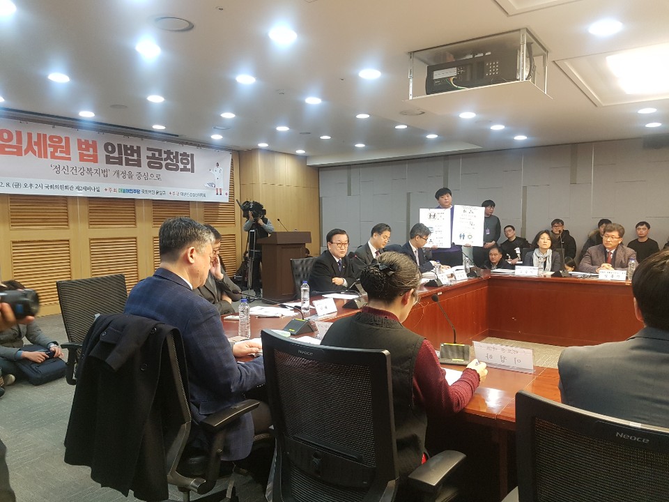 지난 8일 국회 의원회관에서 국회 보건복지위원회 소속 윤일규 더불어민주당 의원 주최로 열린 임세원법 입법 공청회(정신건강복지법 개정을 중심으로)에는 환자와 가족 100여명이 몰려 회의장을 점거한 채 “자유가 치료다”, “이주할 섬을 달라” 등의 구호를 외치며 법 개정 철회를 촉구했다.
