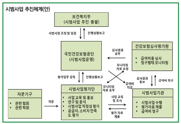 또한 시범사업 대상 질환은 급여 후보질환 중 우선순위가 높은 요통, 기능성 소화불량, 알러지 비염, 슬통, 월경통, 아토피 피부염 환자에 대해 적용하는 방식과 함께 이들 질환에 갱년기장애, 관절염, 뇌혈관질환 후유증 관리, 우울장애, 불면증, 치매를 포함한 12개로 확대하되 재정 지출규모가 큰 요통, 관절염 등의 경우는 65세 이상 환자로 적용대상을 한정하는 안이 제시됐다.