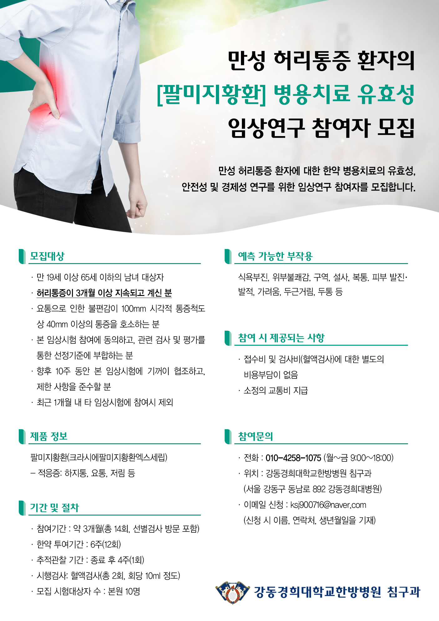 [한의신문=강환웅 기자] 강동경희대한방병원 침구과 서병관 교수팀은 만성 요통 환자에 대한 팔미지황환 병용치료의 유효성, 안전성 및 경제성 평가 임상연구 참여자를 모집한다.