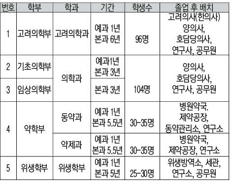 고려의학부를 중심으로 의학대학 전 과정 중 배우게 되는 과목들을 열거하면 대략 다음과 같다.