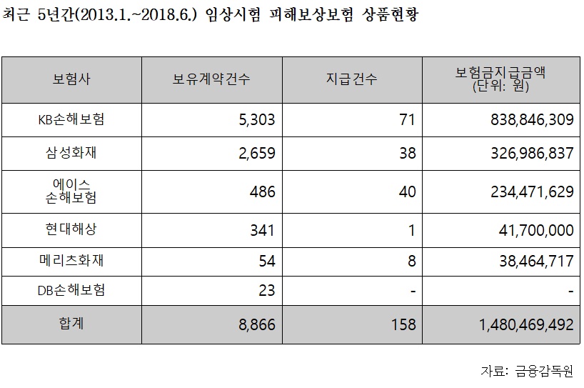 국회 보건복지위원회 바른미래당 간사인 최도자 의원이 금융감독원으로부터 제출받은 '임상시험 피해보상보험 상품운용 현황'에 따르면 최근 5년간(2013년 1월∼2018년 6월) 임상시험 피해보상보험 가입건수는 총 8866건으로, 이 가운데 실제로 피해보상이 지급된 것은 158건(가입건수 대비 1.8%)으로 나타났다. 지급된 전체 보상금은 총 14억8000만원으로, 건당 보상비용은 약 937만원이었다.