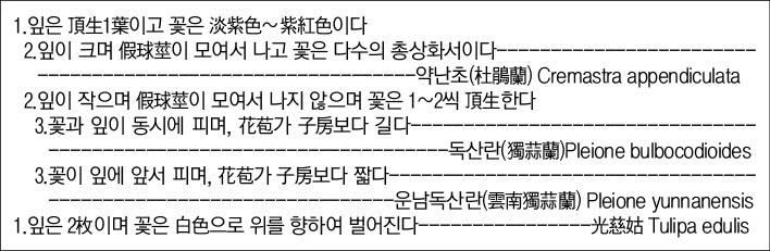 전체적으로 정리하면 유통되는 山慈姑의 종류는 크게 Cremastra屬, Pleione屬, Tulipa屬으로 3大別된다.