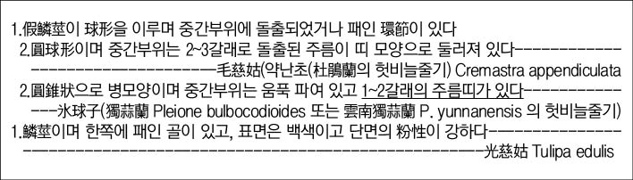 山慈姑 종류의 약재상태의 감별 검색표(discriminative key in Herbs)를 제시하면 다음과 같다.
