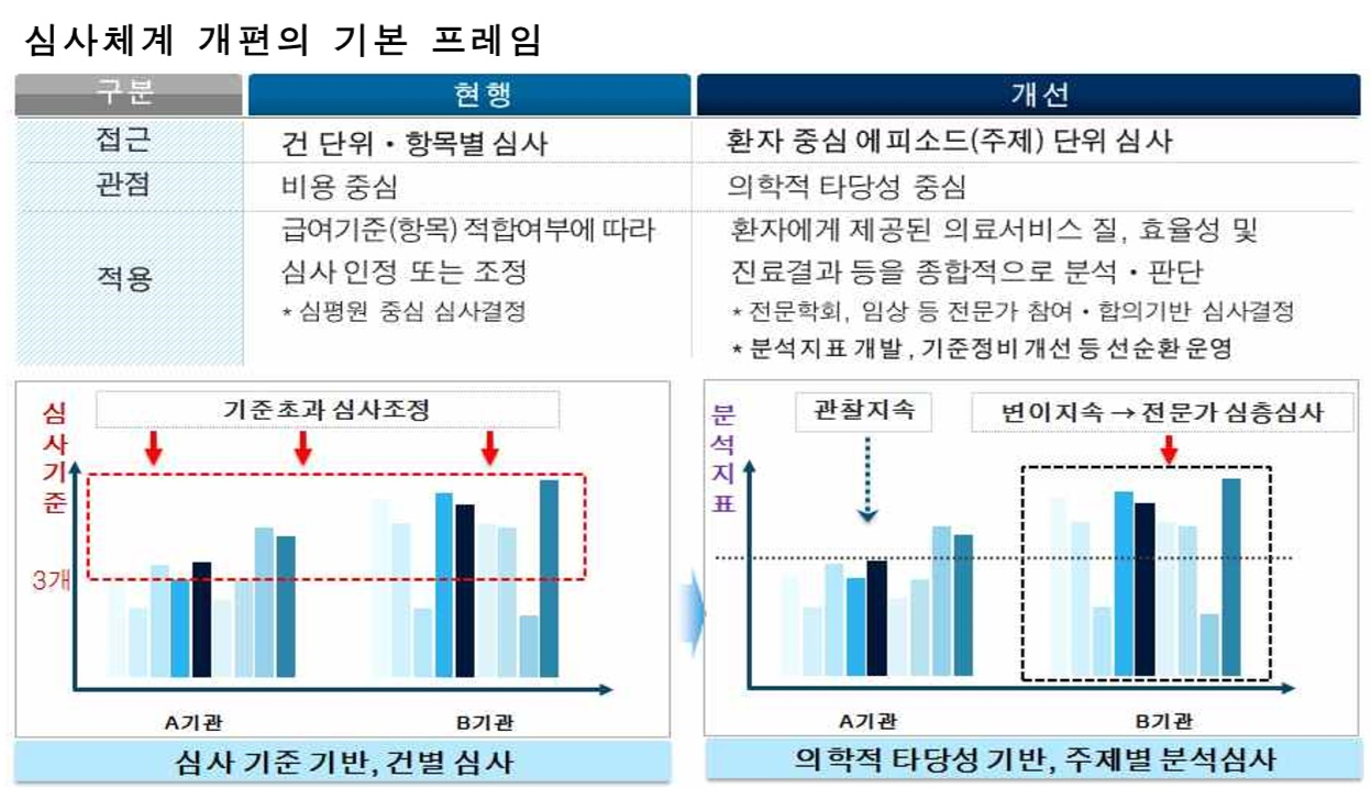 이를 세부적으로 살펴보면 청구 건 단위·진료비 절감 관점에서 환자 중심 에피소드 단위·의학적 타당성 보장의 관점으로의 전환을 위해 에피소드별 진료정보 종합 분석지표, 청구현황 분석 등을 입체적으로 관찰·분석하고, 변이감지시 요양기관 고지 및 중재를 실시하며, 그럼에도 불구하고 이상경향 등이 지속될 경우 심층심사를 실시하게 된다. 또 임상전문가, 전문학회 등이 참여하는 개방형 심사 가이드라인 결정구조를 바탕으로 관련 심사기준은 공개 후 현장에 적용하는 등 심사(급여)기준을 최신 임상진료지침 등으로 대체해 빠르게 변화하는 진료행태를 심사에 적용할 수 있도록 개선하는 한편 기존 미공개·내부 심사기준도 전면 재정비하고, 공개 후 적용원칙을 확립해 나간다는 계획이다.
