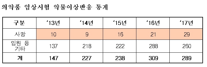 건강세상이 식품의약품안전처(이하 식약처)에 정보공개요청을 통해 제출받은 '의약품 임상시험 약물이상반응(이하 SUSAR) 통계'에 따르면 2013년부터 약물이상반응 보고 건수가 증가하는 추세를 보이고 있으며, 특히 지난 5년간 85명의 사망자가 발생했고, ‘17년 사망자는 ‘13년 대비 3배 가까이 증가했다. 즉 임상시험 사망자가 이렇게 증가하고 있음에도 불구하고 정부에서는 임상시험 사망사고를 줄이기 위한 노력이나 사망원인에 대한 조사계획 등 대응방안 마련은 너무나 미흡하다는 지적이다.