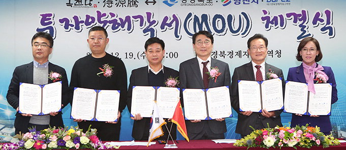 대구경북경제자유구역청(이하 경자청)은 지난 19일 중국기업인 득원중약재판매(유)와 한국의 ㈜옥천당이 경자청에서 전우헌 경상북도 경제부지사, 최기문 영천시장, 이인선 대구경북경제자유구역청장 등이 참석한 가운데 투자양해각서(MOU)를 체결했다고 밝혔다.