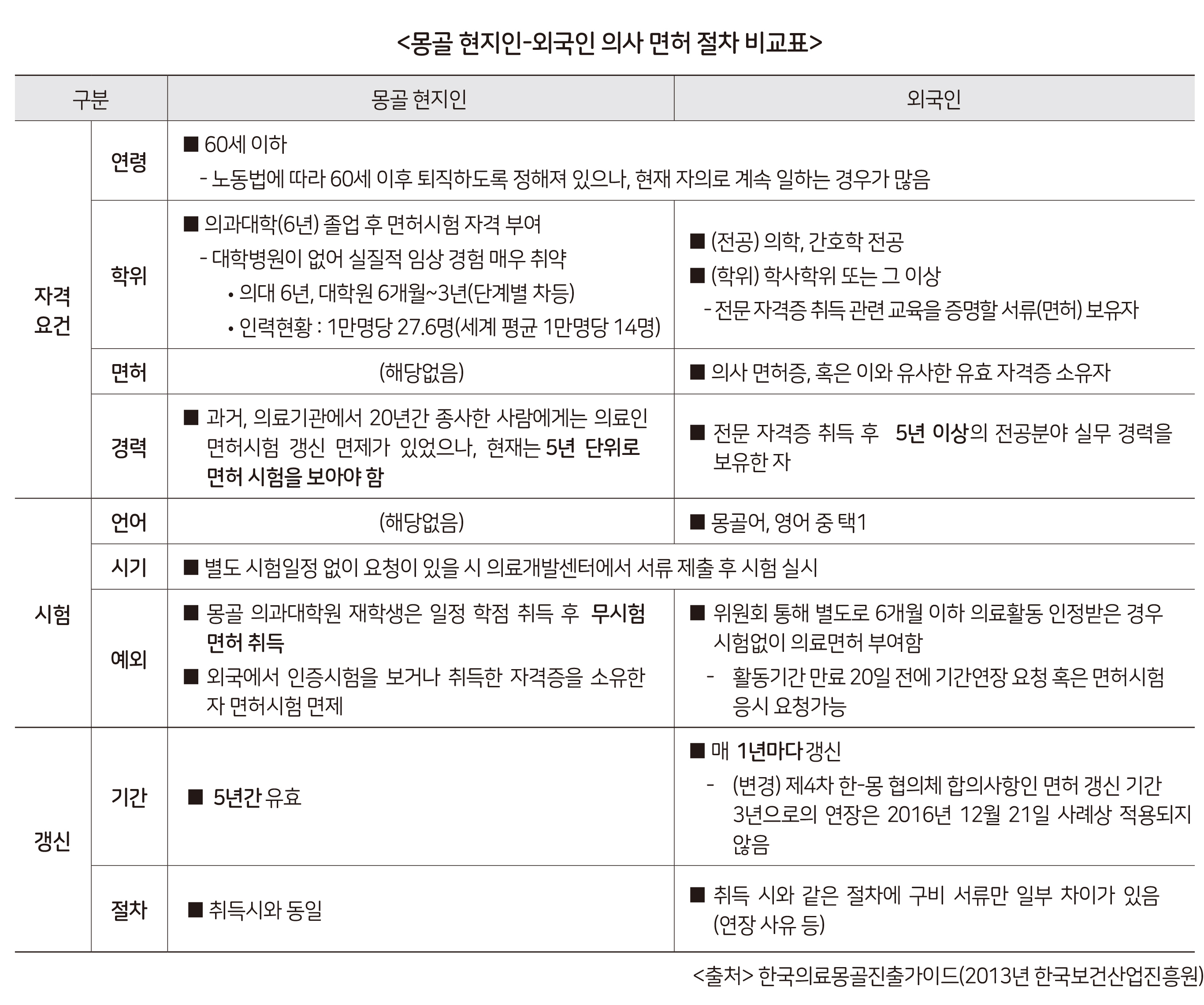 이와 함께 몽골 진출 관련 제도 및 절차를 살펴보면 몽골 한의사 면허를 취득하기 위해서는 임상경험을 가진 자에 한해 몽골어 및 영어로 시험에 응시할 수 있지만, 1년 단위로 재시험을 치러야 한다. 또한 일정 요건을 가진 외국인 의사는 면허 허가를 요청할 수 있으며, 법률에 따라 자격 보유 및 갱신 자격이 제한된다.