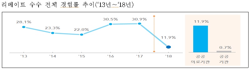 이와 함께 부패경험 및 부패사건 발생 현황 조사에서는 공공의료기관의 경우 리베이트 수수 경험률은 전년 30.9%에서 11.9%로 대폭 하락한 것으로 나타나 이 또한 '청탁금지법' 시행효과가 반영되고 있는 것으로 판단된다.