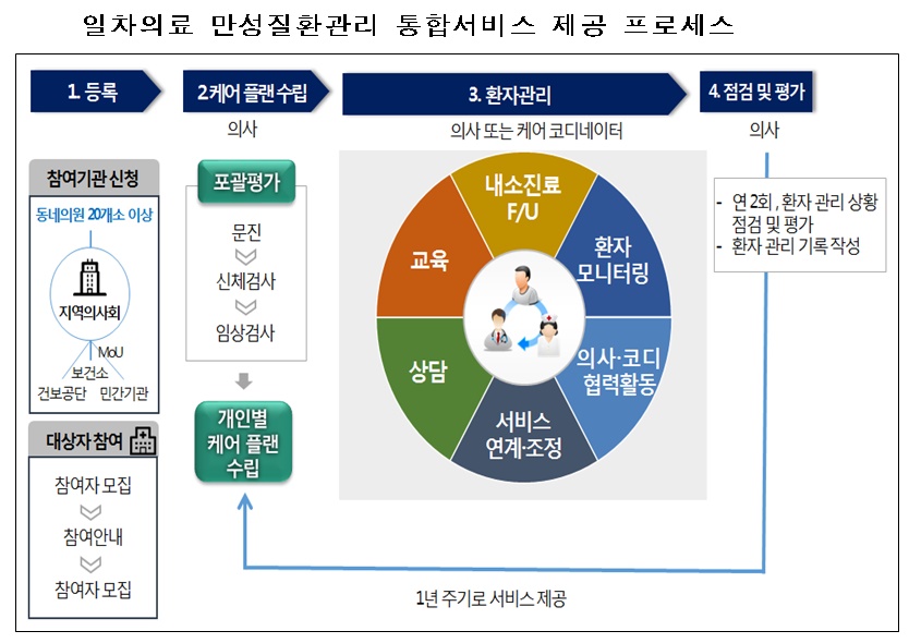 보건복지부는 지난 11일 '고혈압·당뇨병, 동네의원 서비스가 달라집니다'라는 제하의 보도자료를 통해 일차의료 만성질환관리 시범사업을 내년 1월 중순부터 실시할 예정이라고 밝혔다. 이번 시범사업에서는 동네의원의 서비스 향상을 위해 전문인력인 '케어코디네이터'를 활용해 만성질환자에 대한 포괄서비스를 제공한다고 밝히며, 케어코디네이터가 환자 등록·안내, 의사 지원, 환자 모니터링·상담, 진료 안내·확인, 자원연계, 생활습관 개선교육 등 환자 관리업무 전반을 수행한다고 설명한 바 있다.