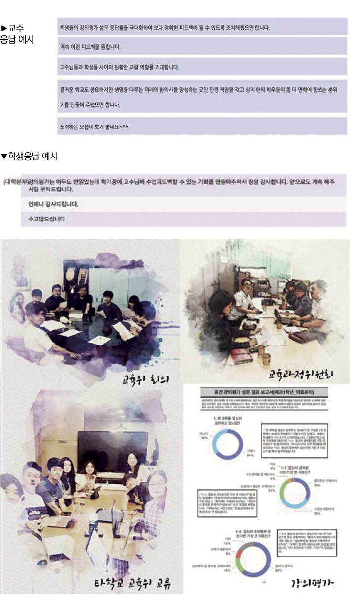 학생들의 수업 분위기에 대해서 교수님들이 생각하는 칭찬할 점과 아쉬운 점을 여쭈어보았고, 학생들에게는 학생들이 느끼고 있는 강의의 장점과 개선되었으면 하는 부분을 물어보았습니다. 이러한 설문 내용들은 매학기 통계 내어 보고서로 작성한 후 나누었습니다. 처음엔 기대와 우려로 시작한 활동들이었지만 생각보다 많은 교수님들과 학생들이 이러한 활동들을 지지하고 응원해주셨고, 교육위원회의 보고서를 꼼꼼하게 봐주시며, 강의에 대한 피드백을 반영해주셨습니다.
