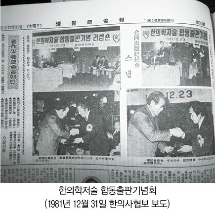 1981년 12월 23일 오후 6시 대한한의학회 주최로 한의학저술 합동출판기념회가 서울 스칸디나비아 클럽에서 100여명의 한의사 회원이 모인 가운데 개최되었다. 대한한의학회 임원과 저자들 40여명과 전임 회장단인 金定濟, 裵元植, 吳昇煥, 李錦浚, 宋長憲 등 협회 중진들을 포함한 100여명이 모여서 축하의 자리를 마련하였다.(이하 1981년 12월 31일자 한의사협보 제316호 참조)