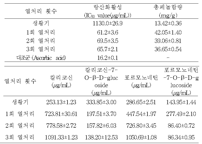 또한 열처리에 의해 황기의 주요 지표물질인 이소플라보노이드(Isoflavonoid) 중 칼리코신(Calycosin)과 포르모노네틴(Formononetin) 함량이 1∼3회 열처리로 2.8∼4.3배, 1.5∼3.6배 증가했다.