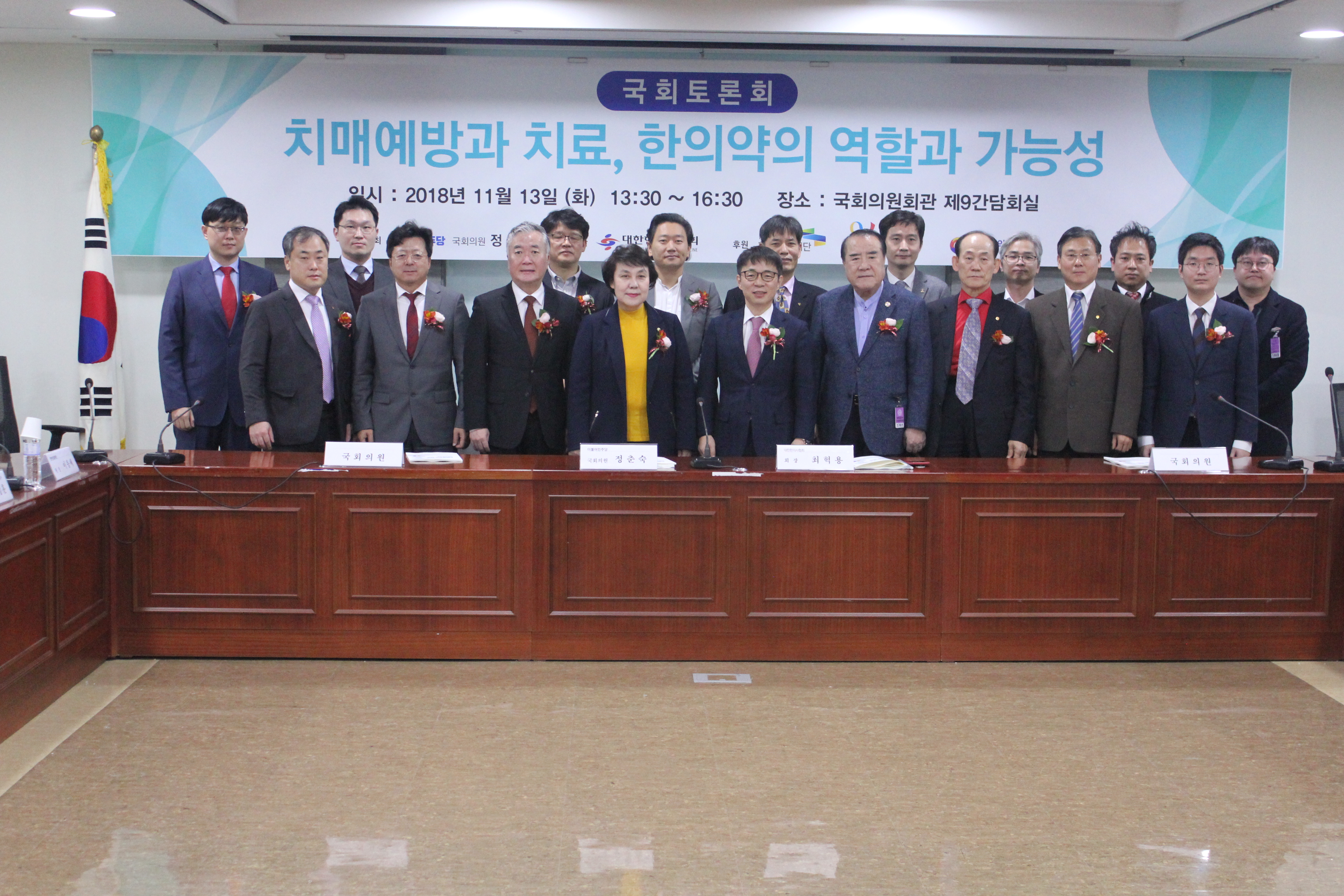 국회 보건복지위원회 정춘숙 의원(더불어민주당)이 주최하고, 대한한의사협회가 주관한 '치매 예방과 치료, 한의약의 역할과 가능성' 국회토론회가 지난 13일 국회의원회관 제9간담회실에서 이응세 한약진흥재단 원장, 김종진 대한한약사회 부회장, 이정만 직능경제단체총연합회 총회장직무대행, 한의협 방대건 수석부회장·박승찬 부의장·최문석 부회장·송미덕 부회장·김경호 부회장, 황재형 용인시한의사회장 등 내외빈이 참석한 가운데 개최됐다.