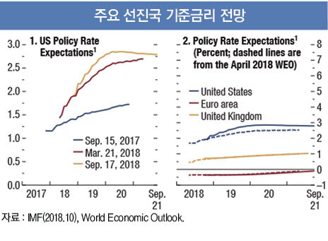 미국의 기준금리 인상속도에 대한 IMF의 기대치(예상치)를 보라. 미국의 기준금리 인상속도가 2017년 9월에 예상했던 것보다 2018년 3월의 예상치가 더 빨라졌고, 2018년 9월에 예상한 것은 또 더 빨라졌다. IMF는 미국뿐만 아니라, 유로존과 영국도 완만한 속도로 기준금리를 인상할 것으로 전망한다.