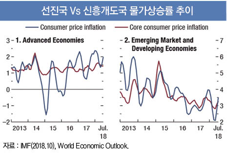 최근 발표된 IMF(2018.10), World Economic Outlook에 따르면, 선진국들의 물가상승률이 완만한 속도로 상승해 왔다. 소비자물가상승률(consumer price inflation) 뿐만 아니라, 근원물가상승률(core consumer price inflation)도 상승해 왔다. 반면, 신흥개도국들의 물가상승률은 상당한 속도로 둔화되었다.